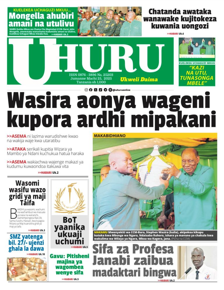 Magazeti JISOMEE MAGAZETI YA LEO JUMANNE MACHI 25, 2025 Last updated: March 25, 2025 5:54 am ccmkwanza Share 0 Min Read SHARE You Might Also Like JISOMEE MAGAZETI YA LEO JUMANNE DESEMBA 23, 2025 JISOMEE MAGAZETI YA LEO JUMAPILI DESEMBA 21, 2025 JISOMEE MAGAZETI YA LEO JUMATANO DESEMBA 10, 2025 JISOMEE MAGAZETI YA LEO JUMAPILI NOVEMBA 23, 2025 JISOMEE MAGAZETI YA LEO JUMAMOSI NOVEMBA 22, 2025 Share This Article Facebook Twitter Copy Link Print Leave a comment Leave a Reply Cancel replyYour email address will not be published. Required fields are marked *Comment * Name * Email * Website Save my name, email, and website in this browser for the next time I comment. Stay Connected235.3kFollowersLike69.1kFollowersFollow11.6kFollowersPin56.4kFollowersFollow136kSubscribersSubscribe4.4kFollowersFollow - Advertisement - Latest News LEO NI LEO TANZANIA NA NIGERIA AFCON Uncategorized December 23, 2025 KATIBU MKUU CCM ATETA NA BALOZI WA JAMHURI YA WATU WA CHINA NCHINI TANZANIA Siasa December 23, 2025 HONGERA VYOMBO VYA ULINZI NA USALAMA KUDHIBITI TISHIO LA MAANDAMANO HARAMU DESEMBA 9 Kitaifa December 21, 2025 DKT. MWIGULU AWEKA JIWE LA MSINGI UJENZI WA KAMPASI YA LINDI YA UDSM Kitaifa December 21, 2025