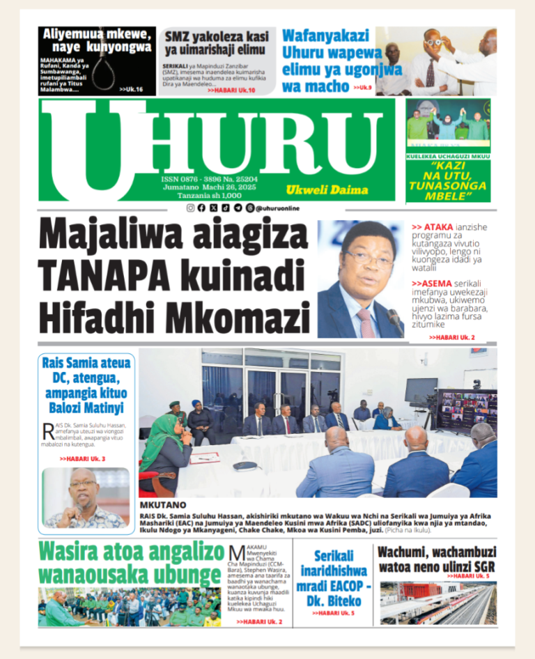 Magazeti JISOMEE MAGAZETI YA LEO JUMATANO MACHI 26, 2025 Last updated: March 26, 2025 5:44 am ccmkwanza Share 0 Min Read SHARE You Might Also Like JISOMEE MAGAZETI YA LEO JUMANNE DESEMBA 23, 2025 JISOMEE MAGAZETI YA LEO JUMAPILI DESEMBA 21, 2025 JISOMEE MAGAZETI YA LEO JUMATANO DESEMBA 10, 2025 JISOMEE MAGAZETI YA LEO JUMAPILI NOVEMBA 23, 2025 JISOMEE MAGAZETI YA LEO JUMAMOSI NOVEMBA 22, 2025 Share This Article Facebook Twitter Copy Link Print Leave a comment Leave a Reply Cancel replyYour email address will not be published. Required fields are marked *Comment * Name * Email * Website Save my name, email, and website in this browser for the next time I comment. Stay Connected235.3kFollowersLike69.1kFollowersFollow11.6kFollowersPin56.4kFollowersFollow136kSubscribersSubscribe4.4kFollowersFollow - Advertisement - Latest News LEO NI LEO TANZANIA NA NIGERIA AFCON Uncategorized December 23, 2025 KATIBU MKUU CCM ATETA NA BALOZI WA JAMHURI YA WATU WA CHINA NCHINI TANZANIA Siasa December 23, 2025 HONGERA VYOMBO VYA ULINZI NA USALAMA KUDHIBITI TISHIO LA MAANDAMANO HARAMU DESEMBA 9 Kitaifa December 21, 2025 DKT. MWIGULU AWEKA JIWE LA MSINGI UJENZI WA KAMPASI YA LINDI YA UDSM Kitaifa December 21, 2025