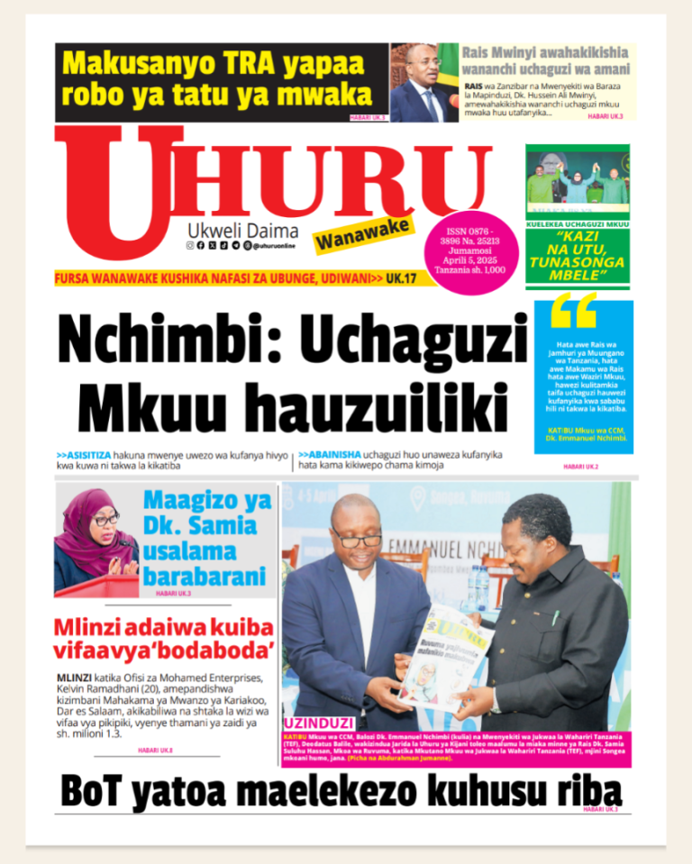 Magazeti JISOMEE MAGAZETI YA LEO JUMAMOSI APRILI 5, 2025 Last updated: April 5, 2025 6:01 am ccmkwanza Share 0 Min Read SHARE You Might Also Like JISOMEE MAGAZETI YA LEO JUMANNE DESEMBA 23, 2025 JISOMEE MAGAZETI YA LEO JUMAPILI DESEMBA 21, 2025 JISOMEE MAGAZETI YA LEO JUMATANO DESEMBA 10, 2025 JISOMEE MAGAZETI YA LEO JUMAPILI NOVEMBA 23, 2025 JISOMEE MAGAZETI YA LEO JUMAMOSI NOVEMBA 22, 2025 Share This Article Facebook Twitter Copy Link Print Leave a comment Leave a Reply Cancel replyYour email address will not be published. Required fields are marked *Comment * Name * Email * Website Save my name, email, and website in this browser for the next time I comment. Stay Connected235.3kFollowersLike69.1kFollowersFollow11.6kFollowersPin56.4kFollowersFollow136kSubscribersSubscribe4.4kFollowersFollow - Advertisement - Latest News LEO NI LEO TANZANIA NA NIGERIA AFCON Uncategorized December 23, 2025 KATIBU MKUU CCM ATETA NA BALOZI WA JAMHURI YA WATU WA CHINA NCHINI TANZANIA Siasa December 23, 2025 HONGERA VYOMBO VYA ULINZI NA USALAMA KUDHIBITI TISHIO LA MAANDAMANO HARAMU DESEMBA 9 Kitaifa December 21, 2025 DKT. MWIGULU AWEKA JIWE LA MSINGI UJENZI WA KAMPASI YA LINDI YA UDSM Kitaifa December 21, 2025