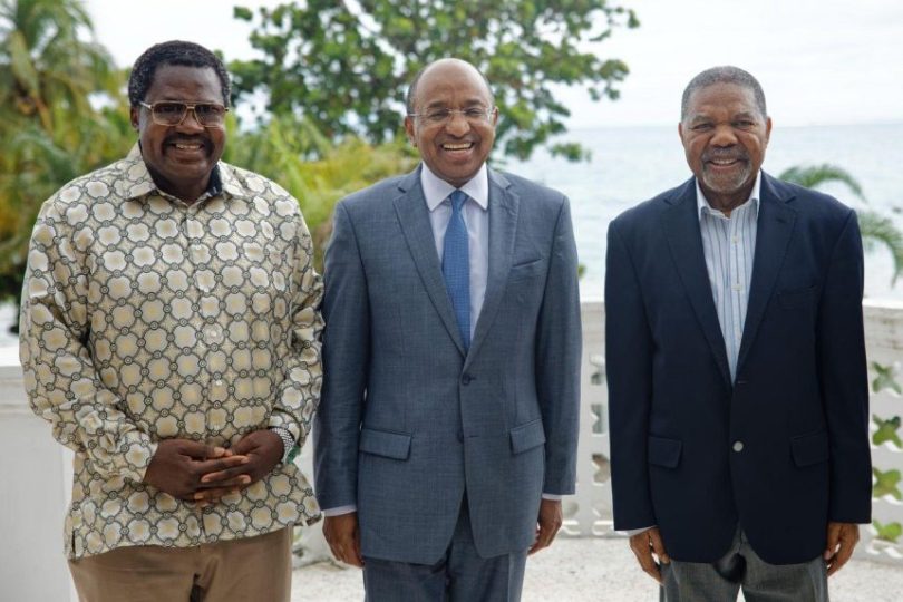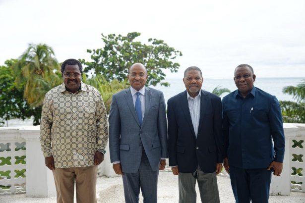 Makamu Mwenyekiti wa Chama Cha Mapinduzi (CCM) Zanzibar, ambaye pia ni Rais wa Zanzibar na Mwenyekiti wa Baraza la Mapinduzi, Dkt. Hussein Ali Mwinyi, akiwa kwenye picha ya pamoja na Katibu Mkuu wa CCM, Balozi Dkt. Emmanuel John Nchimbi, na Makamu Mwenyekiti wa CCM Zanzibar na Rais Mstaafu wa Zanzibar, Dkt. Ali Mohamed Shein, walipokutana Ikulu Zanzibar leo Jumatatu, tarehe 14 Aprili 2025. Mwingine pichani ni Naibu Katibu Mkuu wa CCM Zanzibar, Dkt. Mohamed Said Mohamed Dimwa.