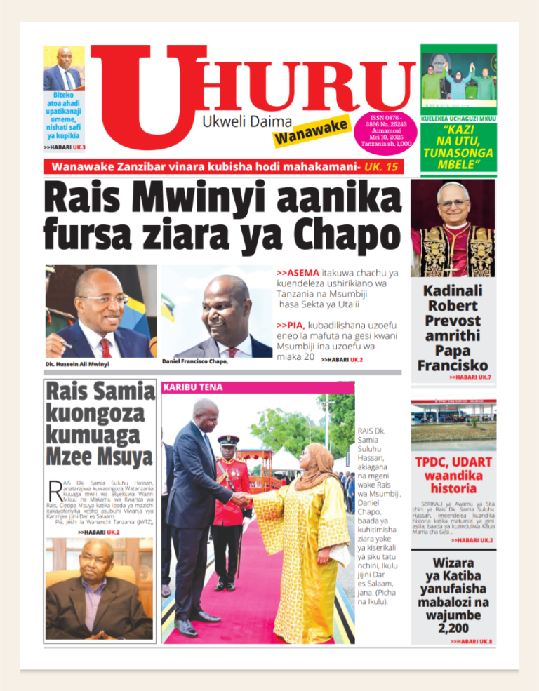 Magazeti JISOMEE MAGAZETI YA LEO JUMAMOSI MEI 10, 2025 Last updated: May 10, 2025 5:50 am ccmkwanza Share 0 Min Read SHARE You Might Also Like JISOMEE MAGAZETI YA LEO JUMANNE DESEMBA 23, 2025 JISOMEE MAGAZETI YA LEO JUMAPILI DESEMBA 21, 2025 JISOMEE MAGAZETI YA LEO JUMATANO DESEMBA 10, 2025 JISOMEE MAGAZETI YA LEO JUMAPILI NOVEMBA 23, 2025 JISOMEE MAGAZETI YA LEO JUMAMOSI NOVEMBA 22, 2025 Share This Article Facebook Twitter Copy Link Print Leave a comment Leave a Reply Cancel replyYour email address will not be published. Required fields are marked *Comment * Name * Email * Website Save my name, email, and website in this browser for the next time I comment. Stay Connected235.3kFollowersLike69.1kFollowersFollow11.6kFollowersPin56.4kFollowersFollow136kSubscribersSubscribe4.4kFollowersFollow - Advertisement - Latest News LEO NI LEO TANZANIA NA NIGERIA AFCON Uncategorized December 23, 2025 KATIBU MKUU CCM ATETA NA BALOZI WA JAMHURI YA WATU WA CHINA NCHINI TANZANIA Siasa December 23, 2025 HONGERA VYOMBO VYA ULINZI NA USALAMA KUDHIBITI TISHIO LA MAANDAMANO HARAMU DESEMBA 9 Kitaifa December 21, 2025 DKT. MWIGULU AWEKA JIWE LA MSINGI UJENZI WA KAMPASI YA LINDI YA UDSM Kitaifa December 21, 2025