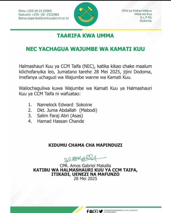 Siasa ASAS ACHAGULIWA KUWA MJUMBE WA KAMATI KUU YA CCM Last updated: May 28, 2025 7:23 pm ccmkwanza Share 0 Min Read SHARE You Might Also Like KATIBU MKUU CCM ATETA NA BALOZI WA JAMHURI YA WATU WA CHINA NCHINI TANZANIA December 6, 2025 SALEHE MHANDO ALA KIAPO CHA UTIIFU NA UZALENDO BUNGENI UFAFANUZI DHIDI YA WANAOJARIBU KUFANYA UPOTOSHAJI KATIKA HOTUBA YA RAIS DKT. SAMIA NA MISINGI YA KUJENGA TAIFA LETU CCM YAITAKA SERIKALI KUCHUKUA HATUA MUAFAKA ZA KUHAKIKISHA NCHI INABAKI KATIKA HALI YA AMANI NA UTULIVU Share This Article Facebook Twitter Copy Link Print Leave a comment Leave a Reply Cancel replyYour email address will not be published. Required fields are marked *Comment * Name * Email * Website Save my name, email, and website in this browser for the next time I comment. Stay Connected235.3kFollowersLike69.1kFollowersFollow11.6kFollowersPin56.4kFollowersFollow136kSubscribersSubscribe4.4kFollowersFollow - Advertisement - Latest News LEO NI LEO TANZANIA NA NIGERIA AFCON Uncategorized December 23, 2025 JISOMEE MAGAZETI YA LEO JUMANNE DESEMBA 23, 2025 Magazeti December 23, 2025 HONGERA VYOMBO VYA ULINZI NA USALAMA KUDHIBITI TISHIO LA MAANDAMANO HARAMU DESEMBA 9 Kitaifa December 21, 2025 DKT. MWIGULU AWEKA JIWE LA MSINGI UJENZI WA KAMPASI YA LINDI YA UDSM Kitaifa December 21, 2025