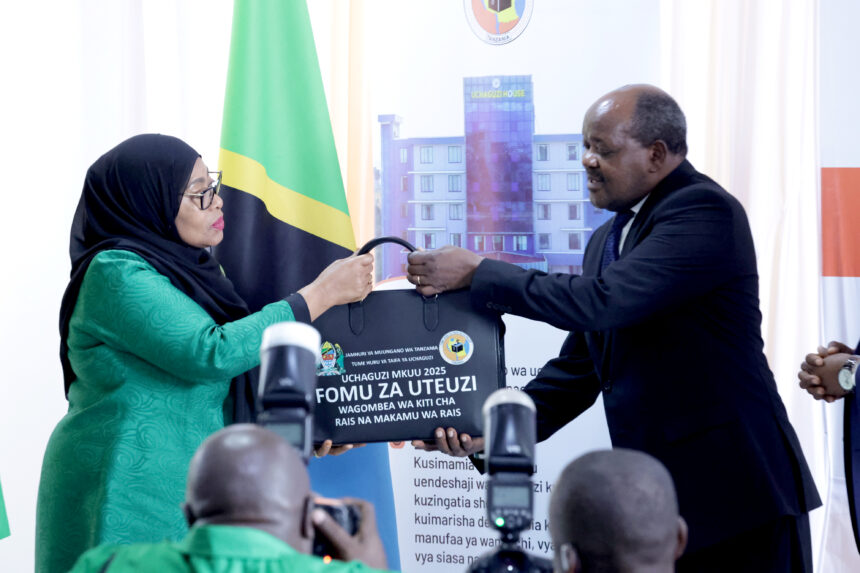 Mwenyekiti wa Tume Huru ya Taifa ya Uchaguzi, Mhe. Jaji wa Mahakama ya Rufaa Jacobs Mwambegele akimkakabidhi mkoba wenye fomu za kuomba kuteuliwa kuwa Mgombea wa Kiti cha Rais na Makamu wa Rais wa Jamhuri ya Muungano wa Tanzania kupitia tiketi ya Chama cha Mapinduzi (CCM), Dkt. Samia Suluhu Hassan. Mgombea huyo wa CCM alichukua fomu hizo leo Agosti 9,2025 ambapo Tume inataraji kufanya uteuzi Agosti 27 mwaka huu.