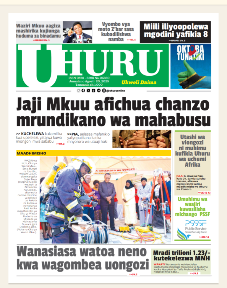 Magazeti JISOMEE MAGAZETI YA LEO JUMATANO AGOSTI 20, 2025 Last updated: August 20, 2025 9:15 am ccmkwanza Share 0 Min Read SHARE You Might Also Like JISOMEE MAGAZETI YA LEO JUMANNE DESEMBA 23, 2025 JISOMEE MAGAZETI YA LEO JUMAPILI DESEMBA 21, 2025 JISOMEE MAGAZETI YA LEO JUMATANO DESEMBA 10, 2025 JISOMEE MAGAZETI YA LEO JUMAPILI NOVEMBA 23, 2025 JISOMEE MAGAZETI YA LEO JUMAMOSI NOVEMBA 22, 2025 Share This Article Facebook Twitter Copy Link Print Leave a comment Leave a Reply Cancel replyYour email address will not be published. Required fields are marked *Comment * Name * Email * Website Save my name, email, and website in this browser for the next time I comment. Stay Connected235.3kFollowersLike69.1kFollowersFollow11.6kFollowersPin56.4kFollowersFollow136kSubscribersSubscribe4.4kFollowersFollow - Advertisement - Latest News LEO NI LEO TANZANIA NA NIGERIA AFCON Uncategorized December 23, 2025 KATIBU MKUU CCM ATETA NA BALOZI WA JAMHURI YA WATU WA CHINA NCHINI TANZANIA Siasa December 23, 2025 HONGERA VYOMBO VYA ULINZI NA USALAMA KUDHIBITI TISHIO LA MAANDAMANO HARAMU DESEMBA 9 Kitaifa December 21, 2025 DKT. MWIGULU AWEKA JIWE LA MSINGI UJENZI WA KAMPASI YA LINDI YA UDSM Kitaifa December 21, 2025