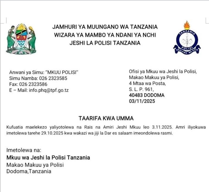 Uncategorized JESHI LA POLISI LATEKELEZA AGIZO LA RAIS SAMIA KUONDOA KIZUIZI CHA KUTOTOKA NJE Last updated: November 4, 2025 1:23 pm ccmkwanza Share 0 Min Read SHARE You Might Also Like LEO NI LEO TANZANIA NA NIGERIA AFCON WAFANYABIASHARA KARIAKOO WAHIMIZA AMANI, WAKITAKA WANASIASA KUACHA MALUMBANO TANZANIA’S 2025 GENERAL ELECTION: WHY PRESIDENT DR. SAMIA PULLED HISTORIC VICTORY BALOZI NCHIMBI ATUA JIMBO LA KAKONKO, KIGOMA NMB YATAMBULIWA KATIKA MAADHIMISHO YA MIAKA 10 YA JKCI Share This Article Facebook Twitter Copy Link Print Leave a comment Leave a Reply Cancel replyYour email address will not be published. Required fields are marked *Comment * Name * Email * Website Save my name, email, and website in this browser for the next time I comment. Stay Connected235.3kFollowersLike69.1kFollowersFollow11.6kFollowersPin56.4kFollowersFollow136kSubscribersSubscribe4.4kFollowersFollow - Advertisement - Latest News KATIBU MKUU CCM ATETA NA BALOZI WA JAMHURI YA WATU WA CHINA NCHINI TANZANIA Siasa December 23, 2025 JISOMEE MAGAZETI YA LEO JUMANNE DESEMBA 23, 2025 Magazeti December 23, 2025 HONGERA VYOMBO VYA ULINZI NA USALAMA KUDHIBITI TISHIO LA MAANDAMANO HARAMU DESEMBA 9 Kitaifa December 21, 2025 DKT. MWIGULU AWEKA JIWE LA MSINGI UJENZI WA KAMPASI YA LINDI YA UDSM Kitaifa December 21, 2025