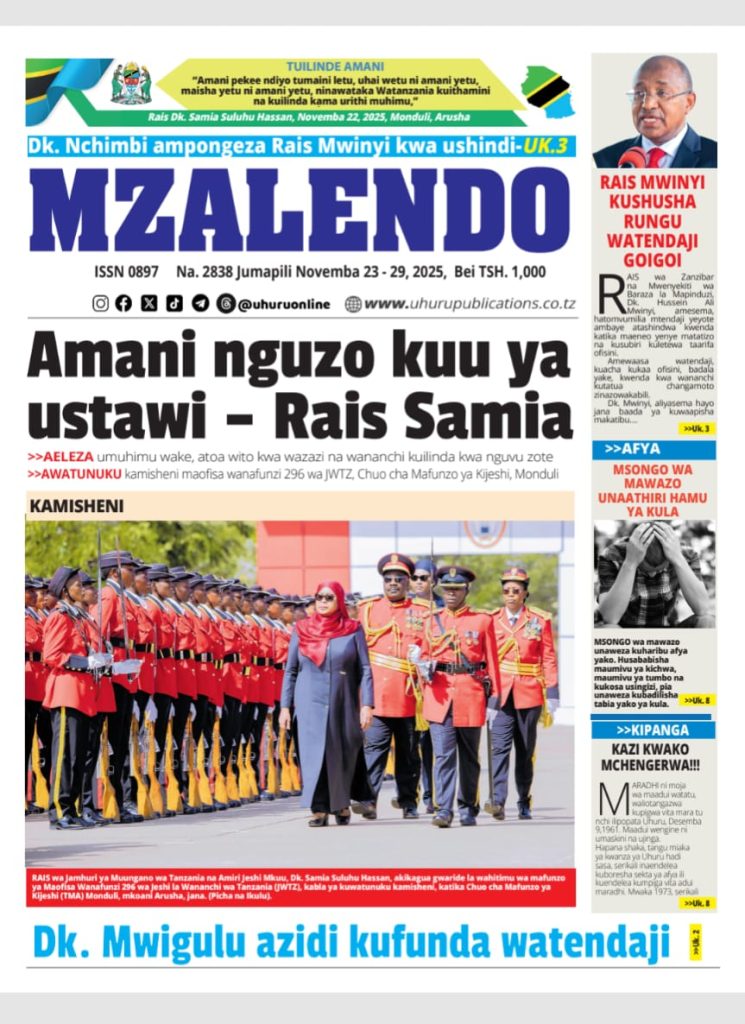 Magazeti JISOMEE MAGAZETI YA LEO JUMAPILI NOVEMBA 23, 2025 Last updated: November 23, 2025 9:27 am ccmkwanza Share 0 Min Read SHARE You Might Also Like JISOMEE MAGAZETI YA LEO JUMANNE DESEMBA 23, 2025 JISOMEE MAGAZETI YA LEO JUMAPILI DESEMBA 21, 2025 JISOMEE MAGAZETI YA LEO JUMATANO DESEMBA 10, 2025 JISOMEE MAGAZETI YA LEO JUMAMOSI NOVEMBA 22, 2025 JISOMEE MAGAZETI YA LEO JUMATATU OKTOBA 27, 2025 Share This Article Facebook Twitter Copy Link Print Leave a comment Leave a Reply Cancel replyYour email address will not be published. Required fields are marked *Comment * Name * Email * Website Save my name, email, and website in this browser for the next time I comment. Stay Connected235.3kFollowersLike69.1kFollowersFollow11.6kFollowersPin56.4kFollowersFollow136kSubscribersSubscribe4.4kFollowersFollow - Advertisement - Latest News LEO NI LEO TANZANIA NA NIGERIA AFCON Uncategorized December 23, 2025 KATIBU MKUU CCM ATETA NA BALOZI WA JAMHURI YA WATU WA CHINA NCHINI TANZANIA Siasa December 23, 2025 HONGERA VYOMBO VYA ULINZI NA USALAMA KUDHIBITI TISHIO LA MAANDAMANO HARAMU DESEMBA 9 Kitaifa December 21, 2025 DKT. MWIGULU AWEKA JIWE LA MSINGI UJENZI WA KAMPASI YA LINDI YA UDSM Kitaifa December 21, 2025